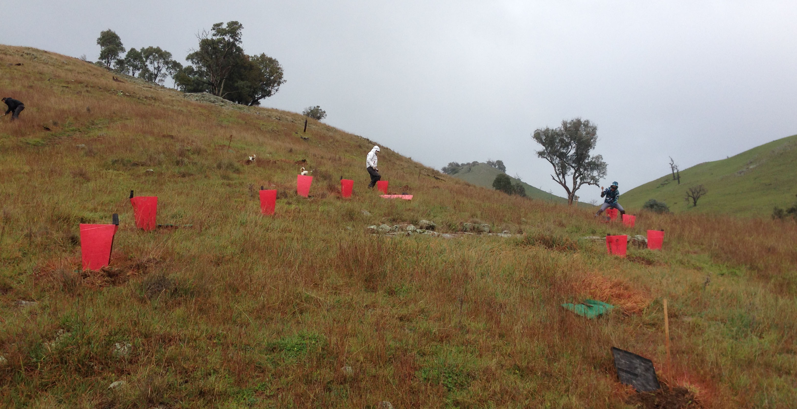 A woodland, it turns out, is not the same thing as a forest. The trees are planted quite far apart. I’ve concentrated them at the top and bottom of the big slope (we were planting the lower ones). The upper ones will form something of a windbreak for the paddocks on the other side. The middle of the slope will only have scattered clumps of trees and shrubs. The native grasses are already doing well here due to this area being rarely grazed in summer, and part of a big paddock the sheep tend to bypass on their way to the creek for water.