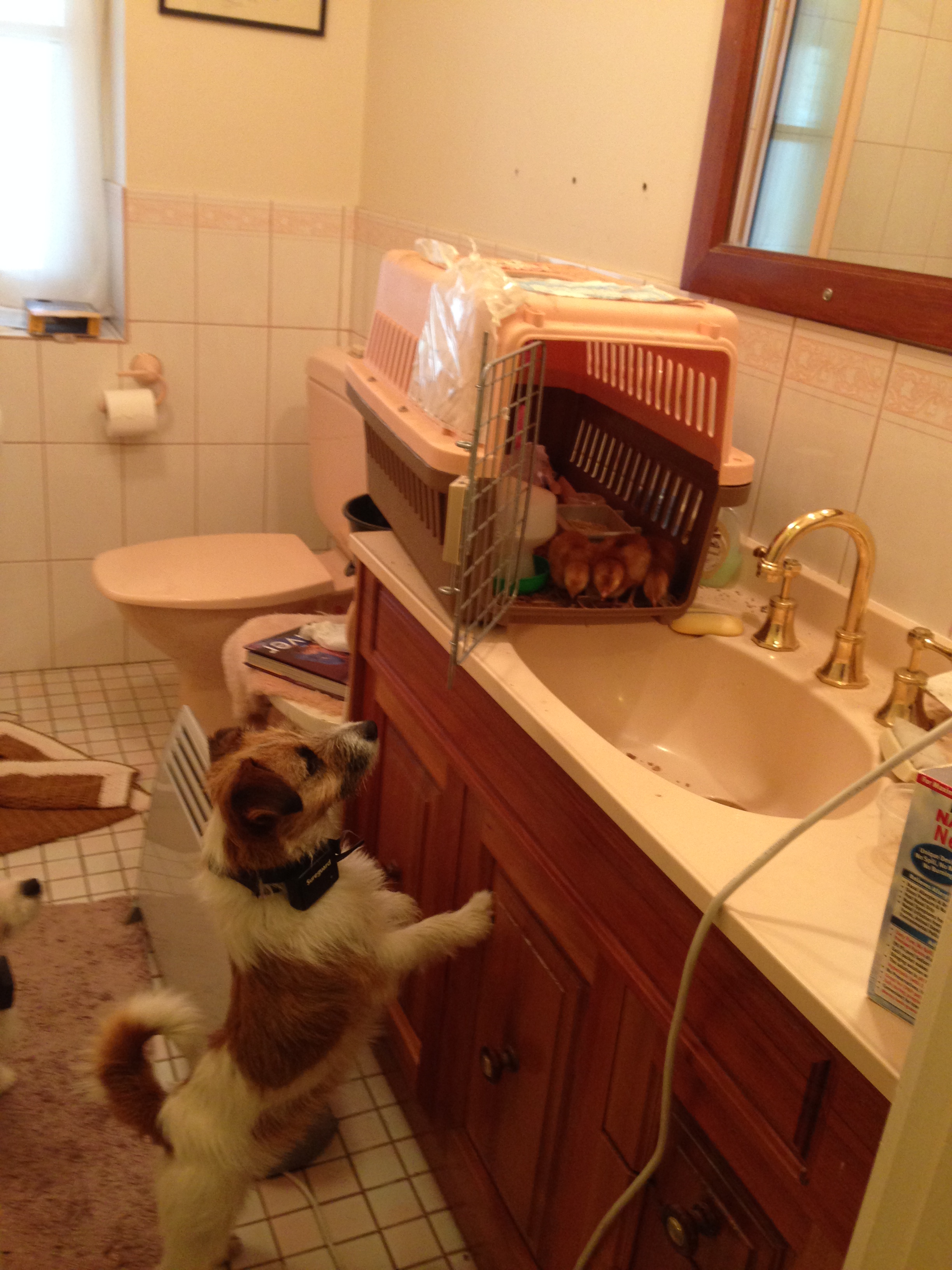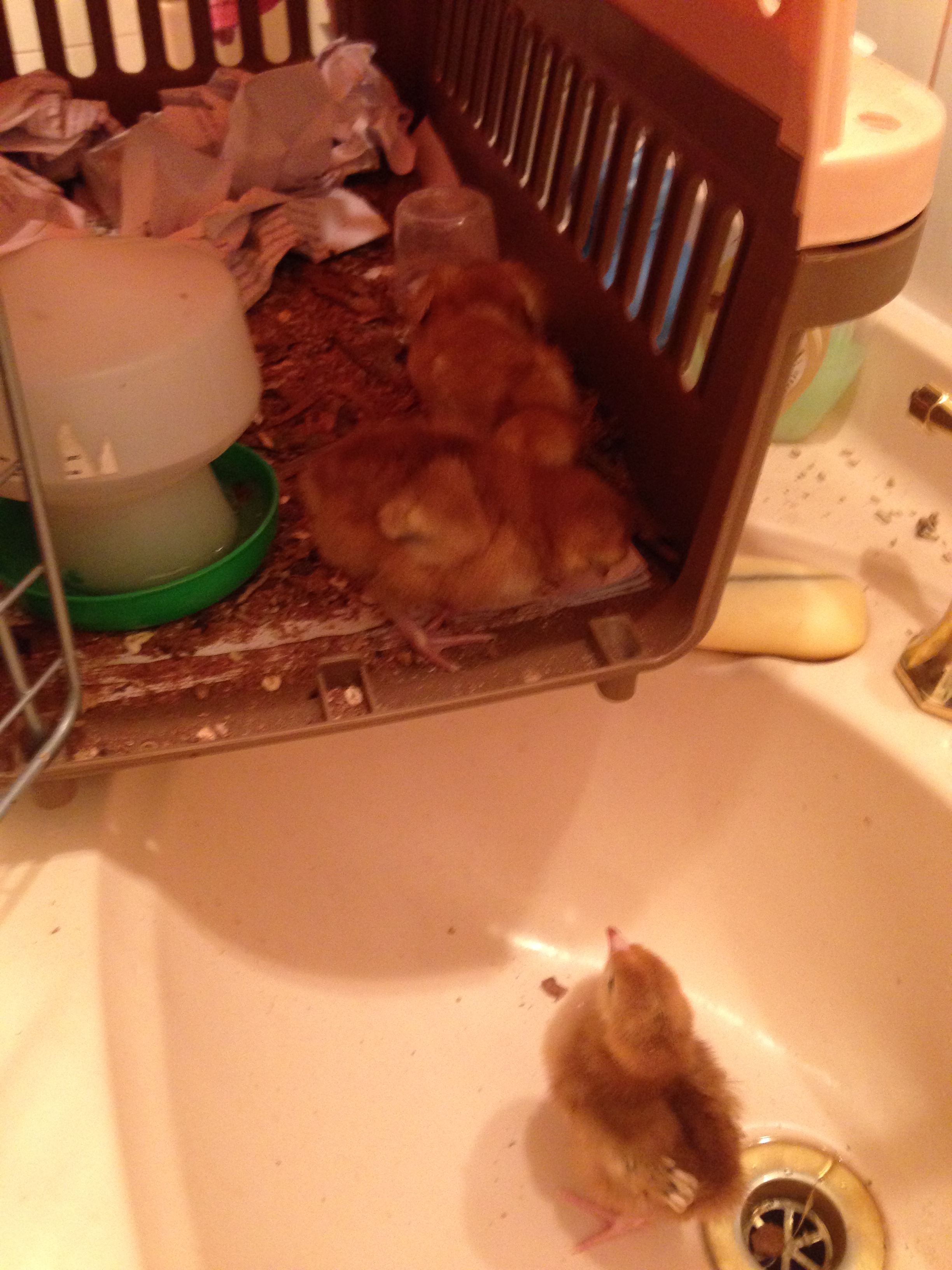 In the first attempt at a brooder box (a puppy travelling cage) the chicks tended to leap for freedom into the hand basin as soon as we opened the door, and even made the effort to squeeze through the mesh if we didn’t block it with cardboard.