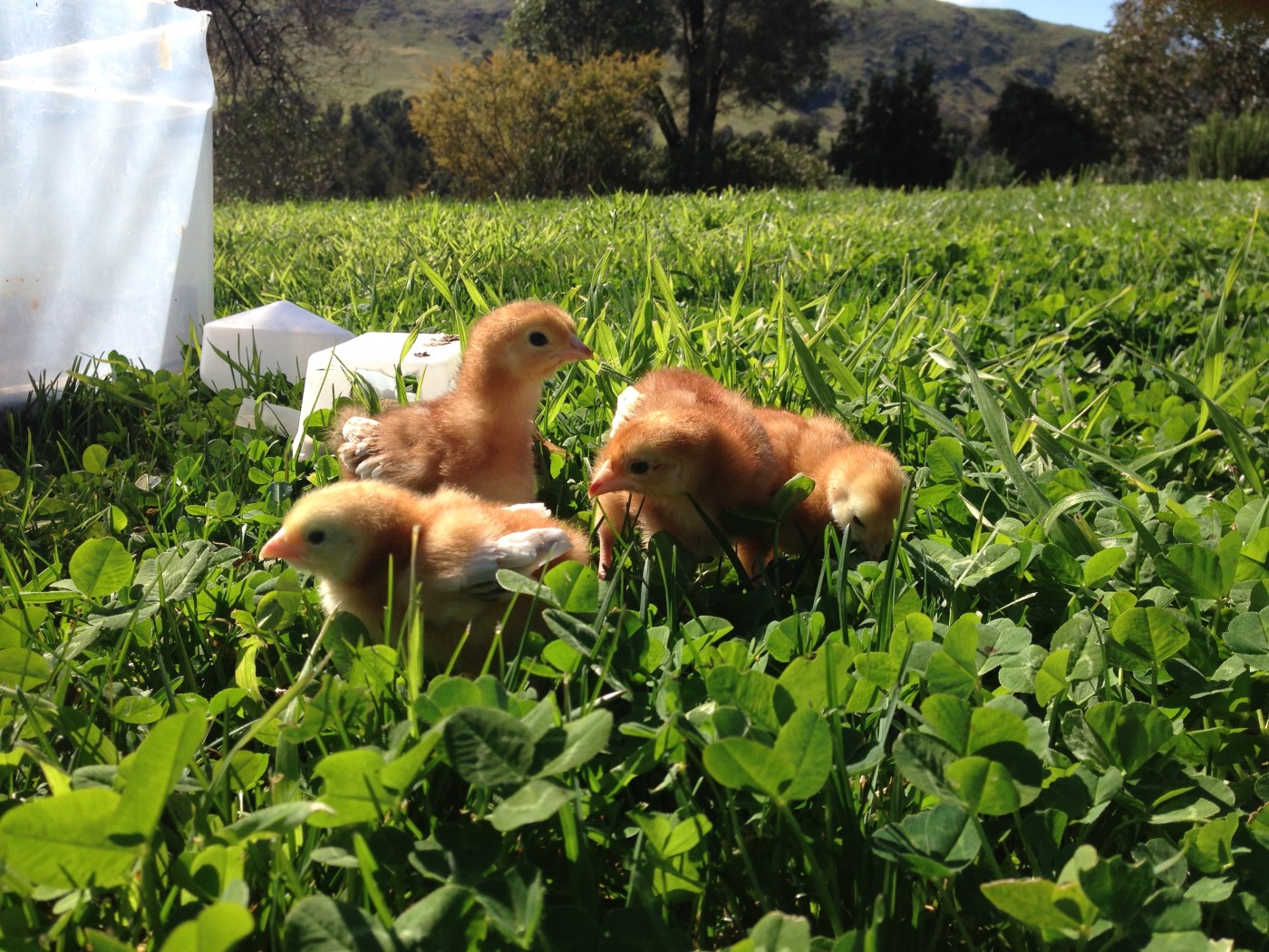 Anyway, the Rhode Island chicks got their first taste of the great outdoors this afternoon. They had a lovely time scratching around and losing themselves in a forest of clover.