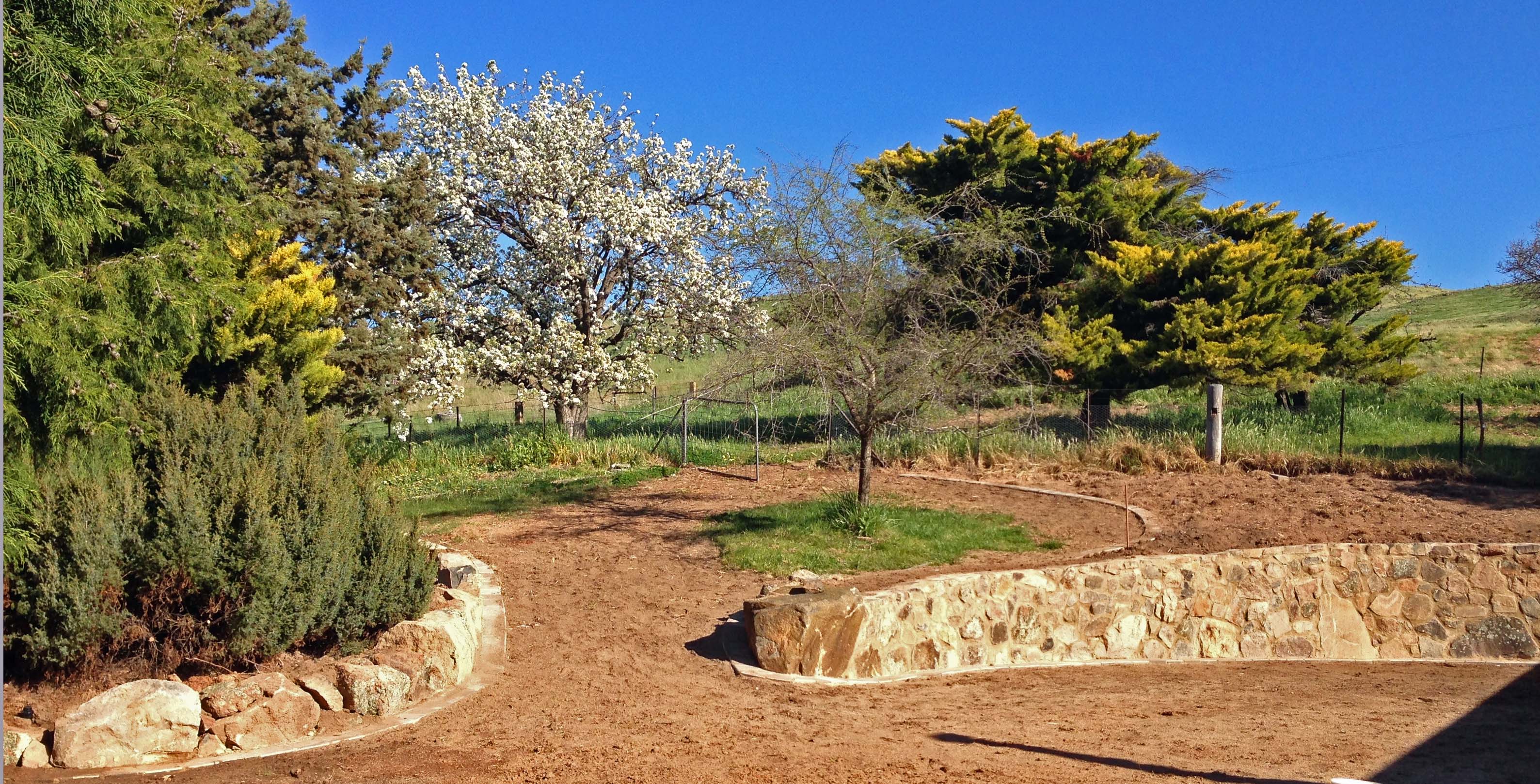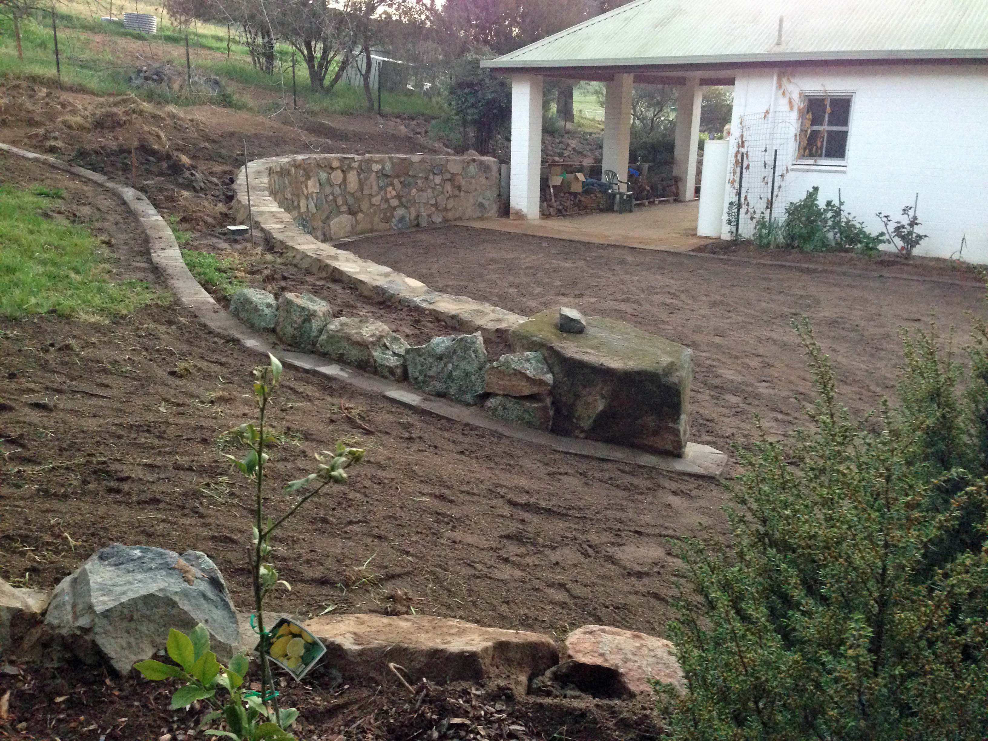 Finally James made a special expedition to the paddock and came back with a monster boulder for the end of the wall. He pushed around the dirt a little, then plonked it into place with the bobcat. Amazing to watch.