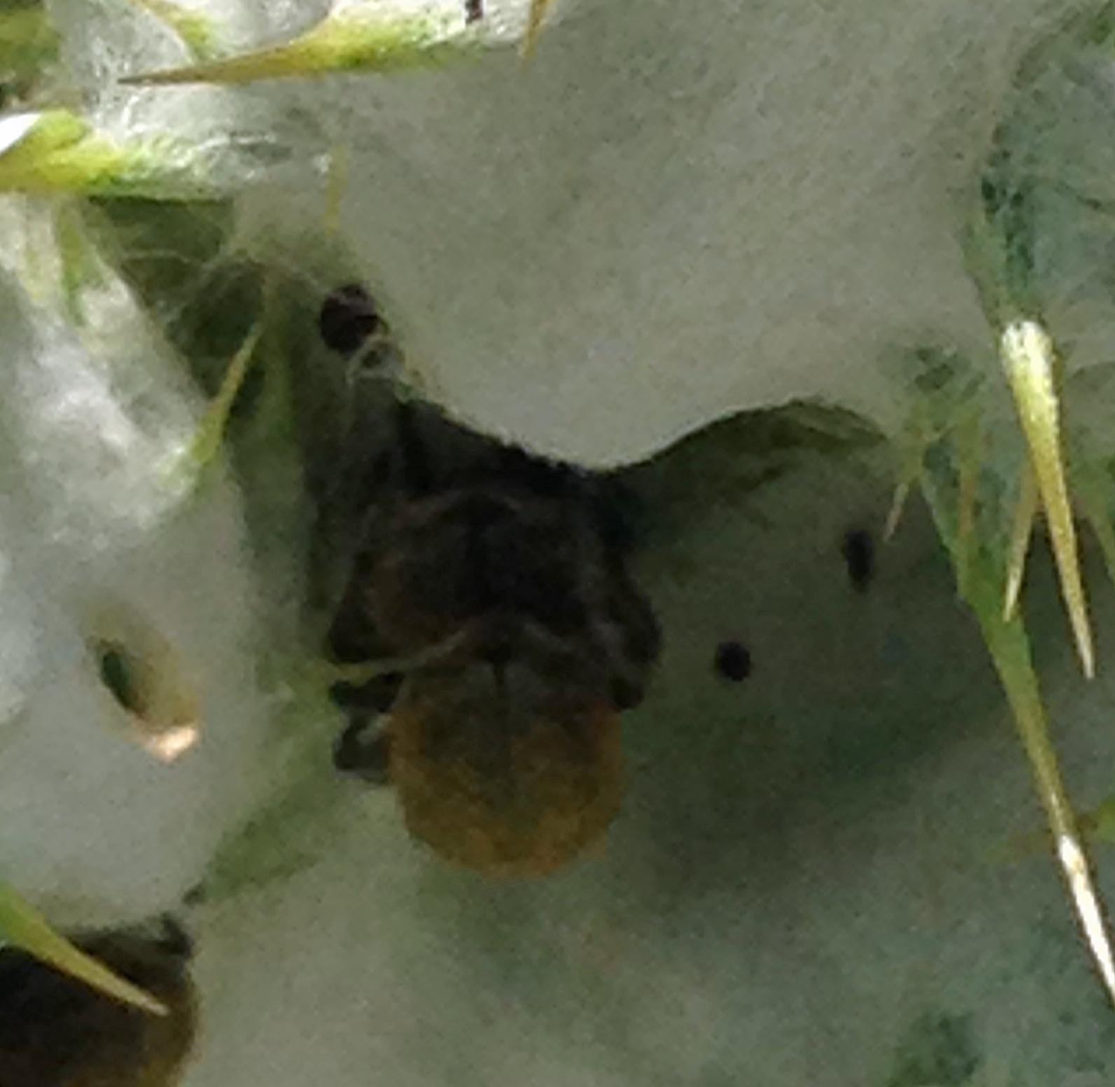 Further down the paddock, there was a different drama going on. I found a spider that seemed to have a group of earwigs cornered. They burrowed as tightly as they could into the prickly crevices, while the spider lurked outside. I haven’t been able to identify the spider as yet and the earwigs seemed to be the European introduced ones.