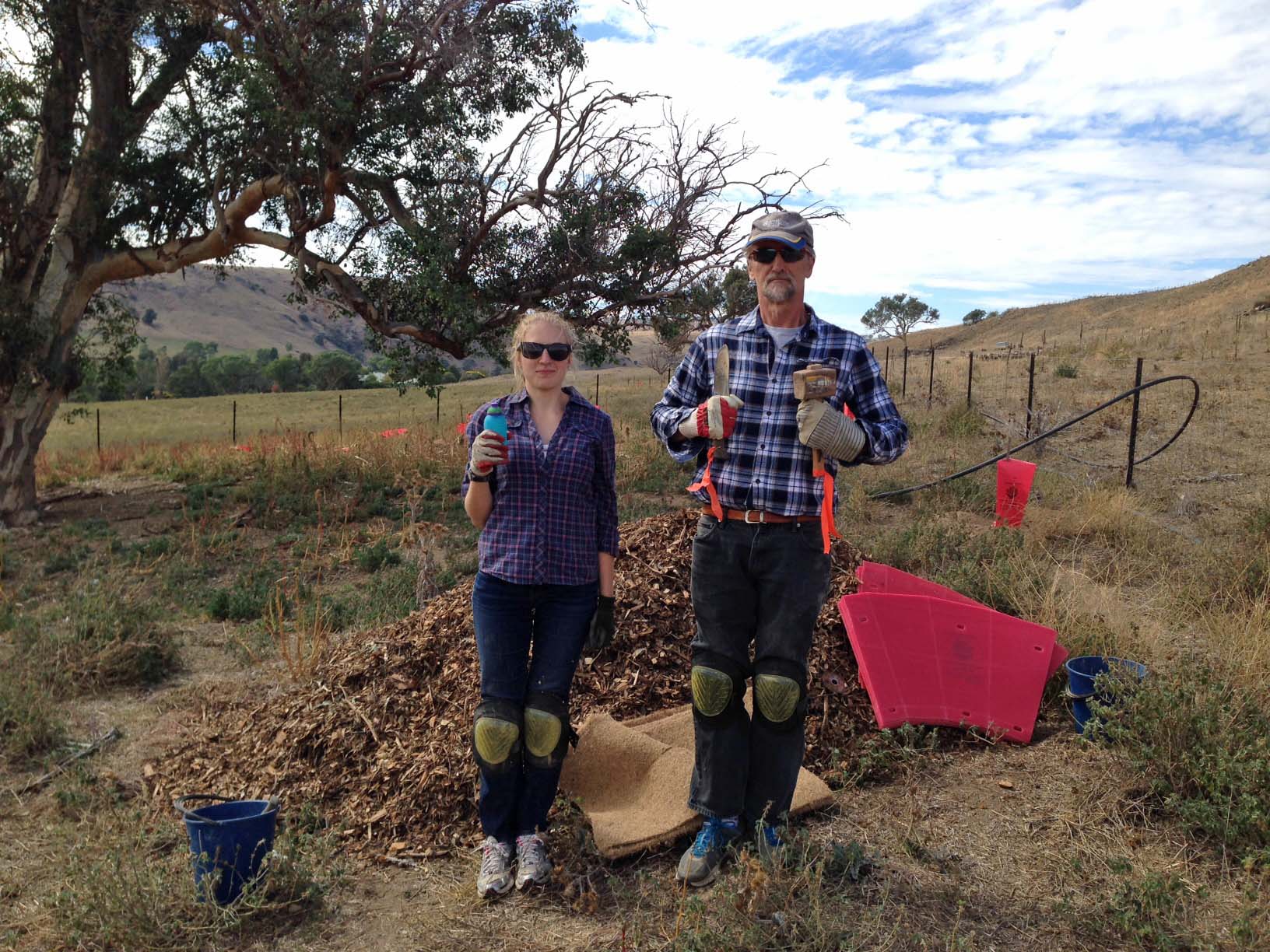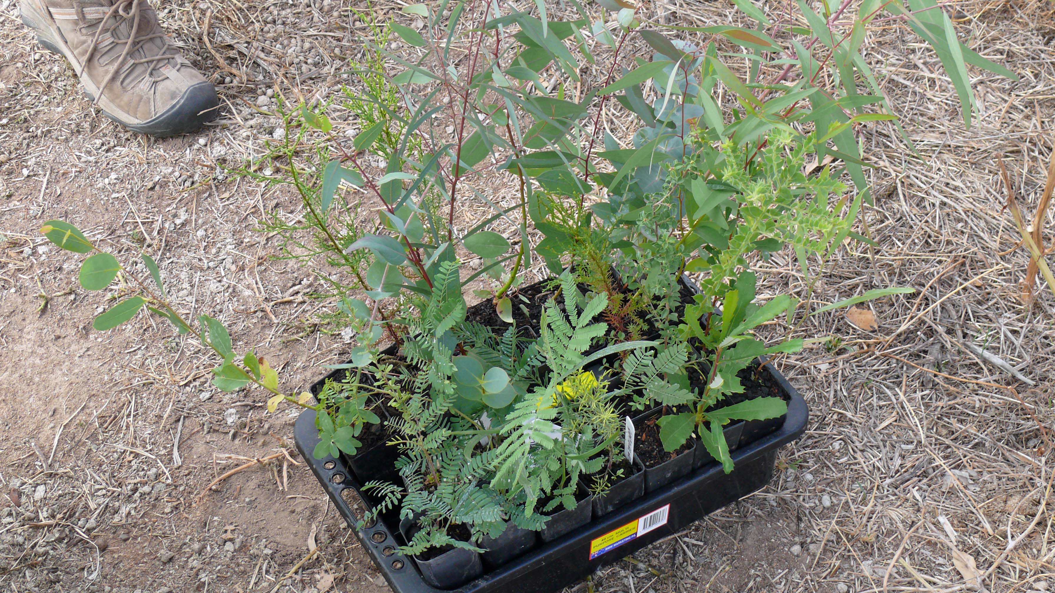 Generally, our method of planting trees and shrubs requires lots of water.  We pour on 10 to 20 litres per tree to give them a head start in our dry landscape.   We add mulch and a stout pink corflute plastic cover to help preserve the humidity, among other things. Then we walk away and hope for the best.  We give them more water if the temperature goes over 40 degrees celsius (that’s 104 in Fahrenheit for people on the old-fashioned measurements).