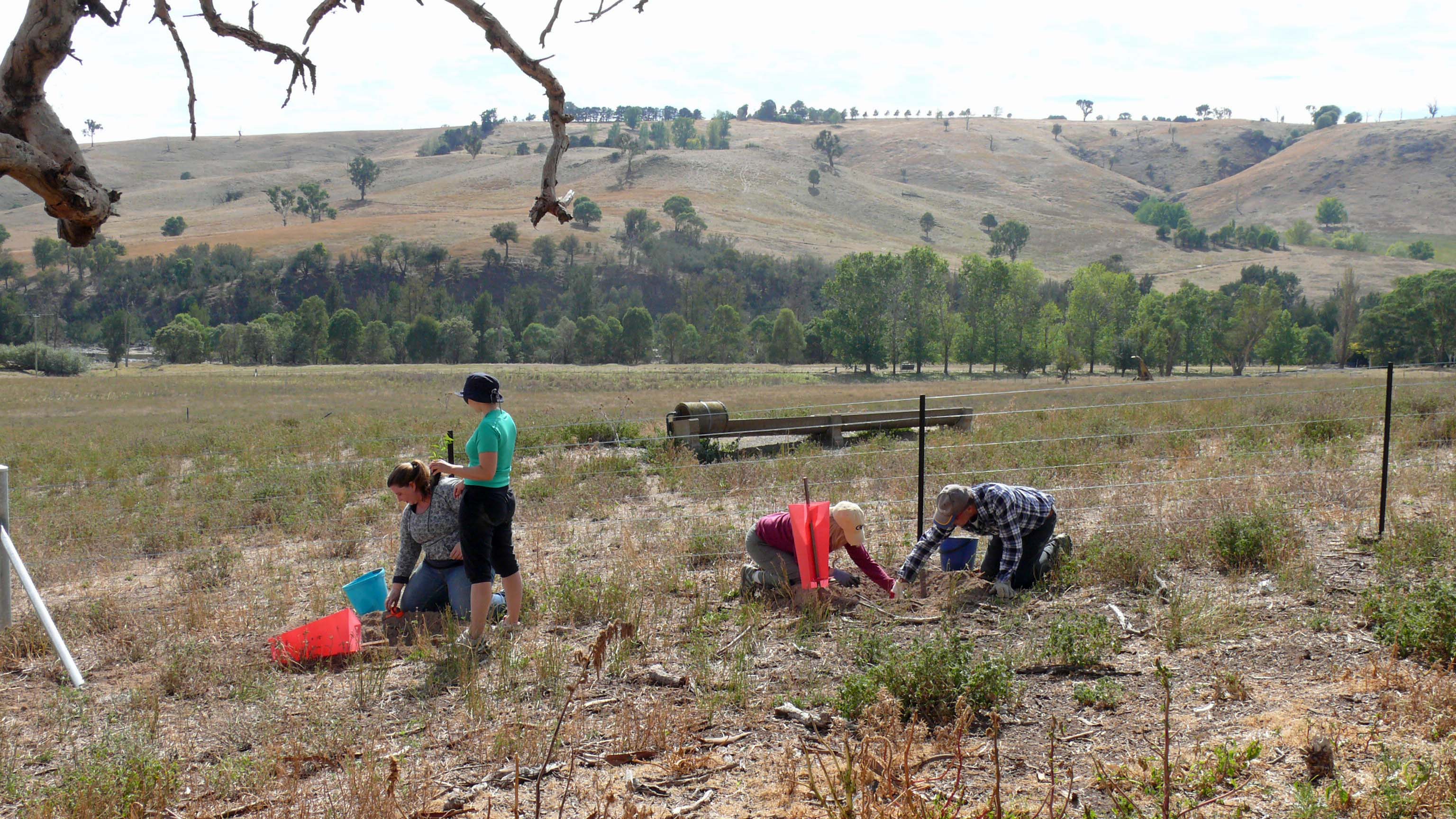 Our lovely planting team turned up on the weekend for festivities and planting. My idea for a fun Easter weekend was to fill the five small enclosures we’d created in the central valley on Esdale.  Valley tree to be protectedThree of the areas surround existing ancient Blakely’s Red Gums (eucalyptus blakelyi) which I’m hoping either to save or get their successors started.   Digging holes in the Lucerne paddock gullyOne area was in a small gully that cuts across the arable paddock, and the last one was along a fence to the side.  All of them will in time make new stepping stones for the flight of small birds across the landscape.  They will connect with the five we planted last year, joining Mullion Creek towards the river through otherwise very bare paddocks. From 2015 stepping stone enclosure looking uphill to 2014 stepping stone enclosures Esdale Last year’s enclosures were funded by the Kosciuszko to Coast Foundation, this year’s by NSW Local Land Services, which has taken up the idea of linking landscapes by strategically placed tree clusters.