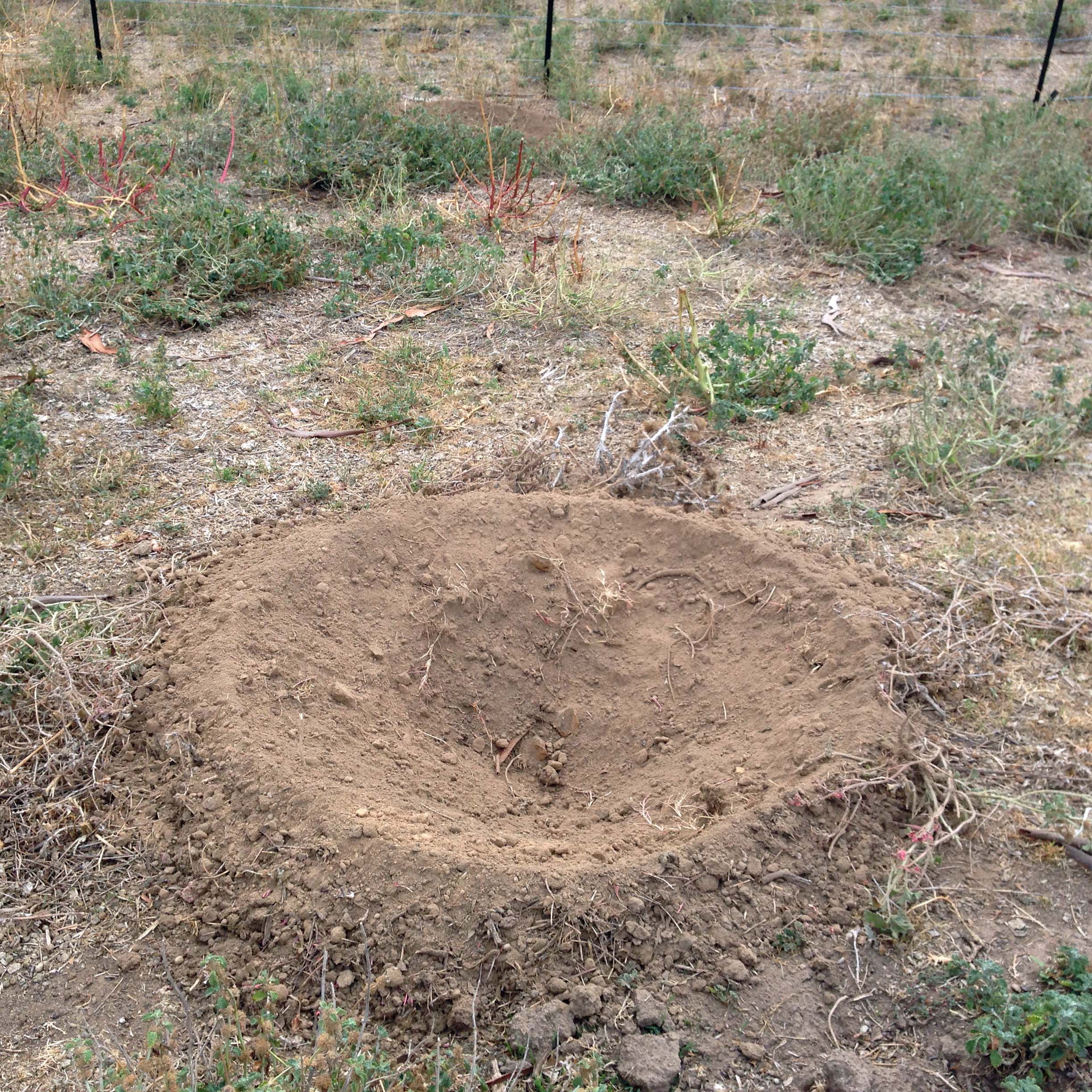 Matt Kilby and his Tree AugerMatt Kilby from Global Land Repair dug holes in the dust with his fancy tree-planting auger.  Auger and pink markingWe had a lot of trouble finding the holes I’d marked out with pink paint on the ground.  I’m definitely going back to using stakes as markers after this, but remembering to spray or slash to the side of them so the stakes don’t have to be pulled up when the hole is dug.  Tree planting hole very dry