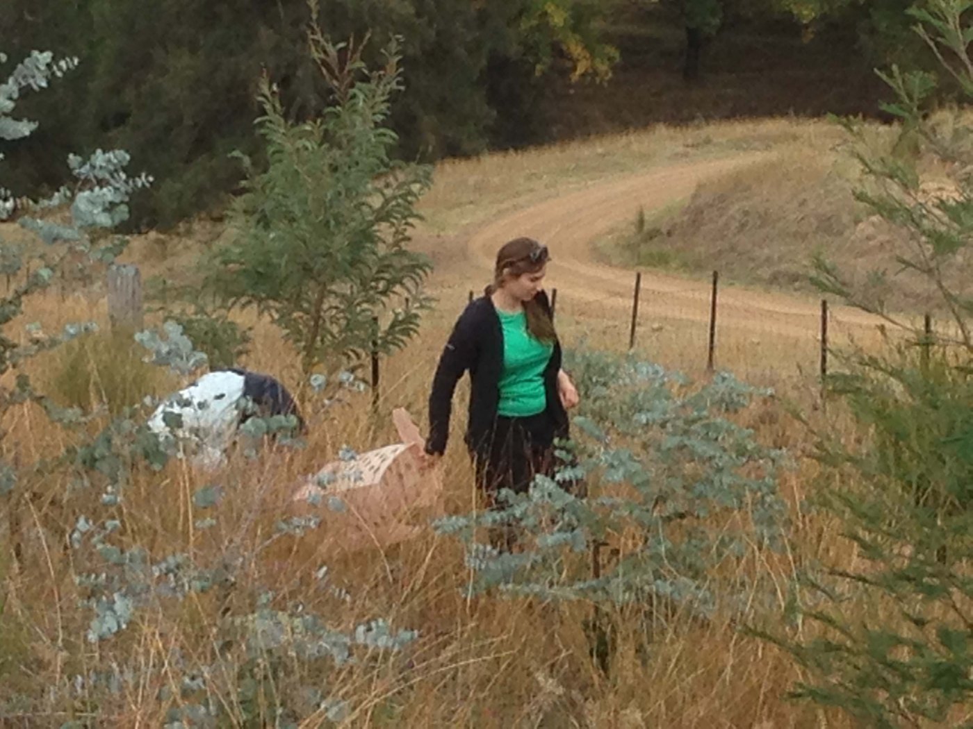 On the Easter weekend we had a whole crew of helpers to strip remaining covers from the 450 trees and shrubs planted in May 2013 near the cattleyards. Also known as “Georgia’s Patch”. Some of the wattles are now pretty tall and visible from a distance. That’s great for being able to see them when you drive past. The eucalypts have also taken off since the last time we looked at them in January, although the apple boxes (eucalyptus bridgesiana) tend to flop about when they’re released and disappear into the long grass.