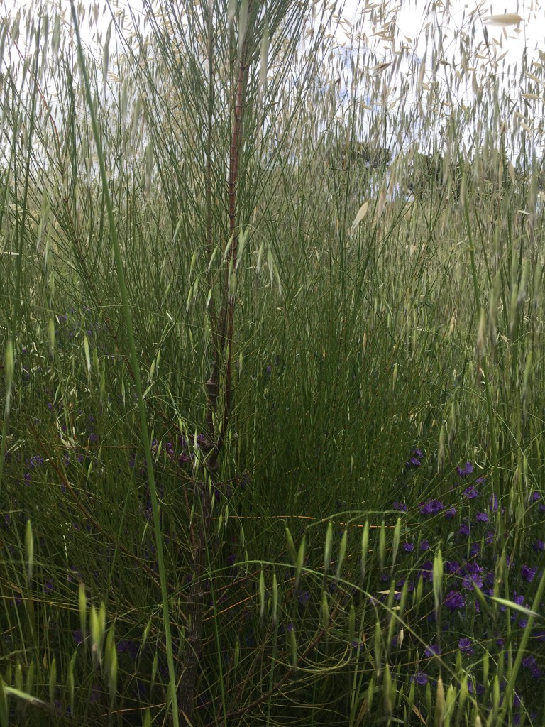 In my tree plots the wild oats grew tall and when I was out checking on trees and pulling covers, Priya could once again disappear within moments.  Unfortunately, the allocasuarinas also disappear which is a bit unsatisfying.  Craig calls them “invisible trees”.  Finally, some of the ones that were planted in the first Glossy Black Cockatoo plot can be seen waving their needles at us from the top of the far ridge.