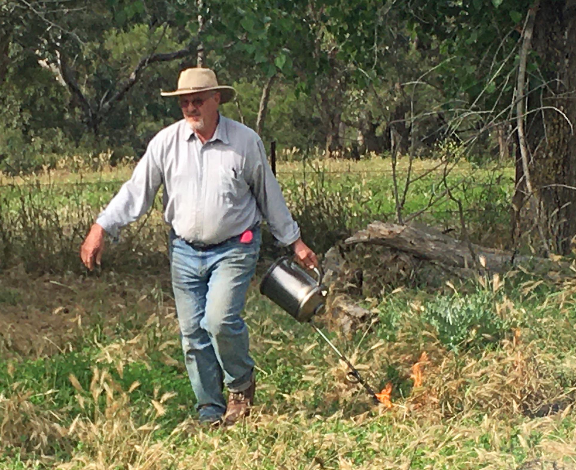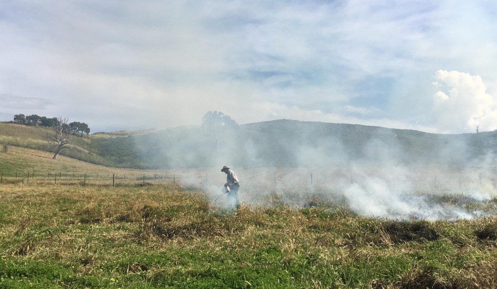 We also had a fun couple of days burning (with a permit) barley grass (hordeum sp) which is an annual pasture grass that crowds out others and has seeds that get into the eyes of grazing sheep. My plan is to experiment with promoting perennial grasses and break us out of the ugly cycle of barley grass – bare ground- caterpillar weed and bathurst burr- bare ground – barley grass. I’ve been accused of liking my drip torch too much, but on this occasion it was Craig who went too far and burned one of my trees. Grr. I’m taking my drip torch back…
