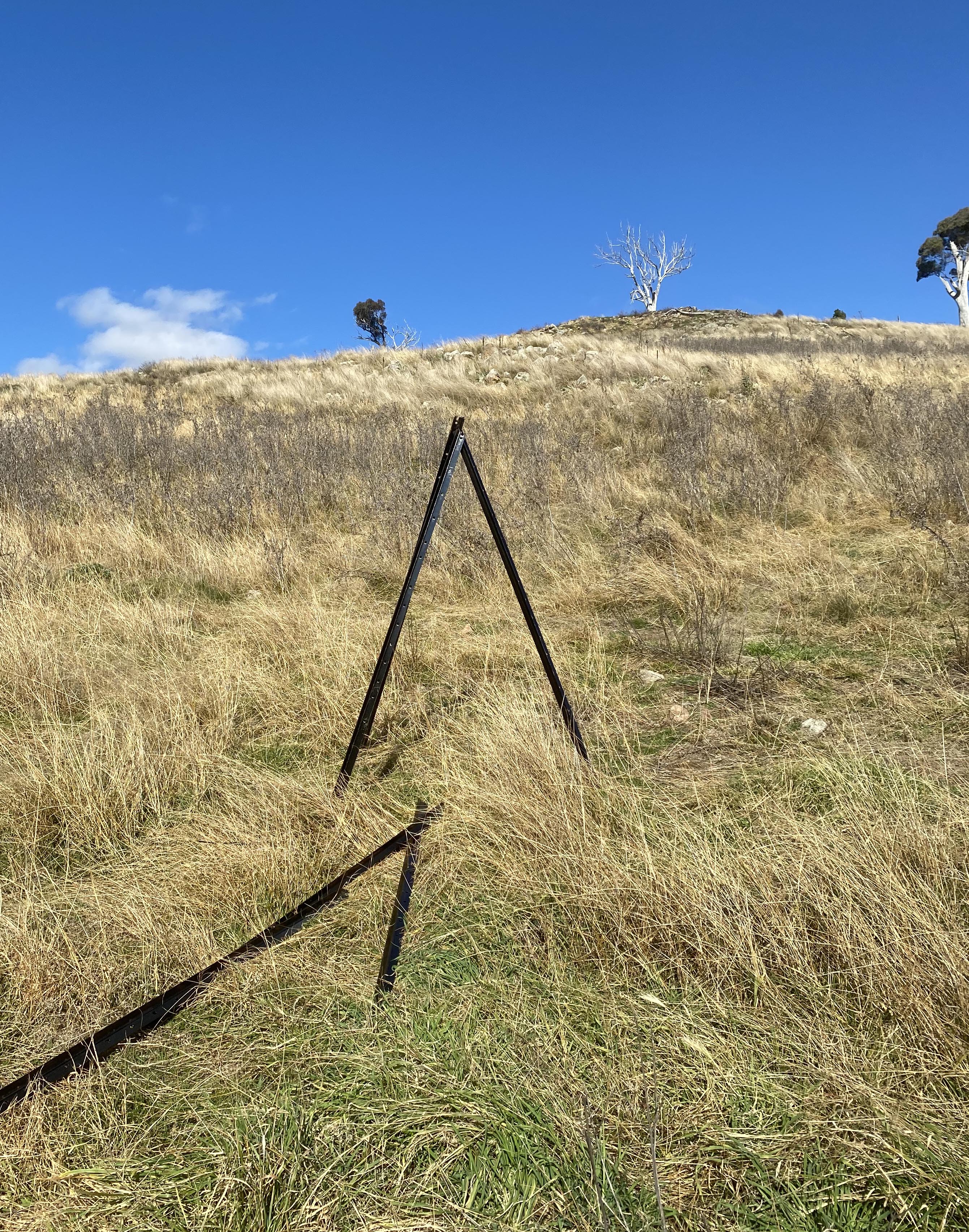 Because this year’s location for my mini-triangles is quite steep, we dropped the whole collection near the track where the trailer could be safely turned around. That meant a lot of carrying sheets around until we figured out that we could hitch the mesh onto the four wheel drive ute and transport them like a bridal train to the individual locations we needed.