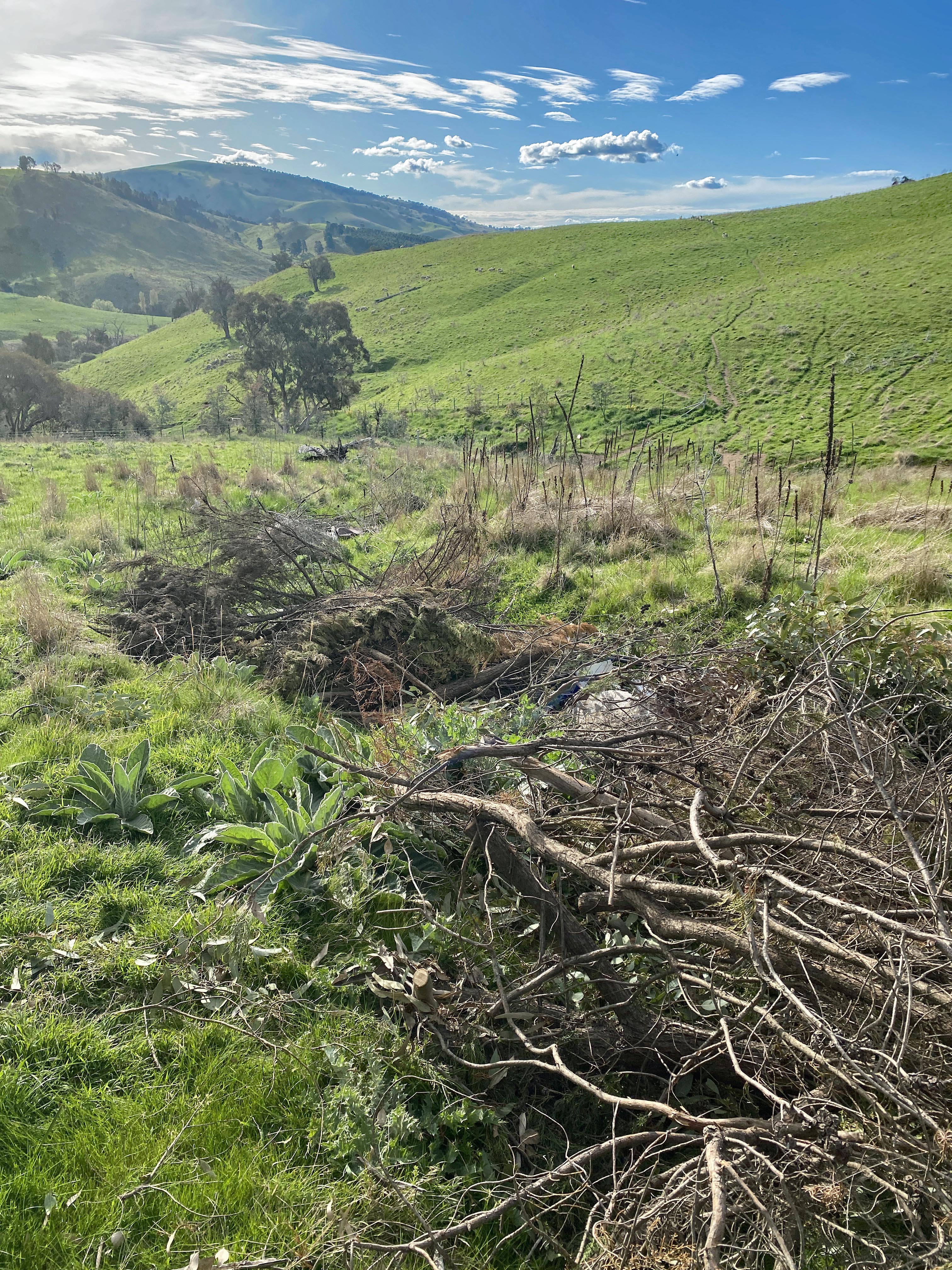 Finally, I realised that we had to find another gully to protect, so I chose one of Dad’s erosion control projects on Adnamira. Because there were lots of old appliances, fridges, stoves, kerosene tins, old tyres and other junk lying around from the previous owners hoarding, he threw them all into some narrow washouts where they’ve done some good, but the fridges still stick out, and the whole thing looks like a junk pile.