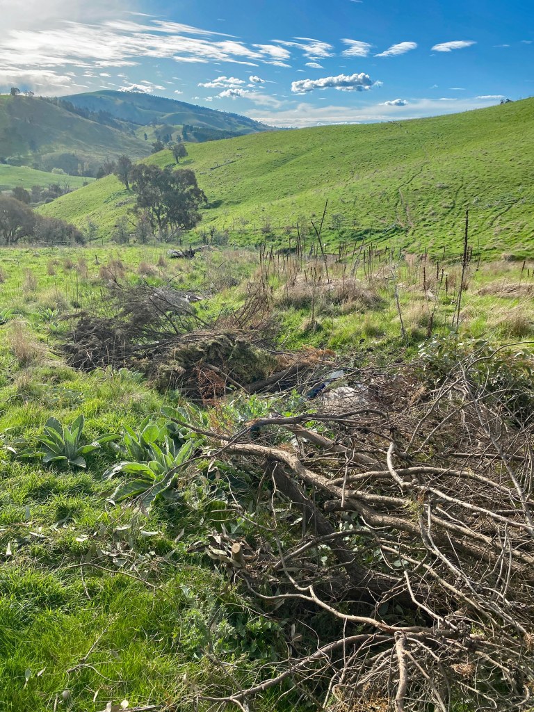 I’ve done this before with some success in one of the two gullies we planted around in 2020. That included hundreds of old tyres which break down into toxic compounds in sunlight, so it’s helpful to get them undercover. There were also two old Volkswagen beetles, looking pretty much the worse for wear. I found after going back and checking on the coverup job, that someone or something had moved the branches away from one of the Beetles so they could open the door and look inside.