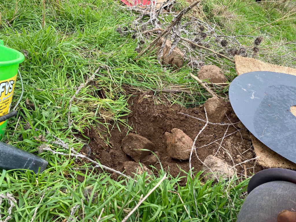 First we had to go back and find the trees that didn’t quite make it from last year. I’ve now conclusively established that Phalaris grass is a killer of young native trees, and has to be sprayed out to stop it doing that . The only other grass that is a similar problem is couch. Otherwise the mulch maps are effective. We had to re-do 80 in one of last year’s windbreaks, but the main area along the pine line was in very good shape (no Phalaris).