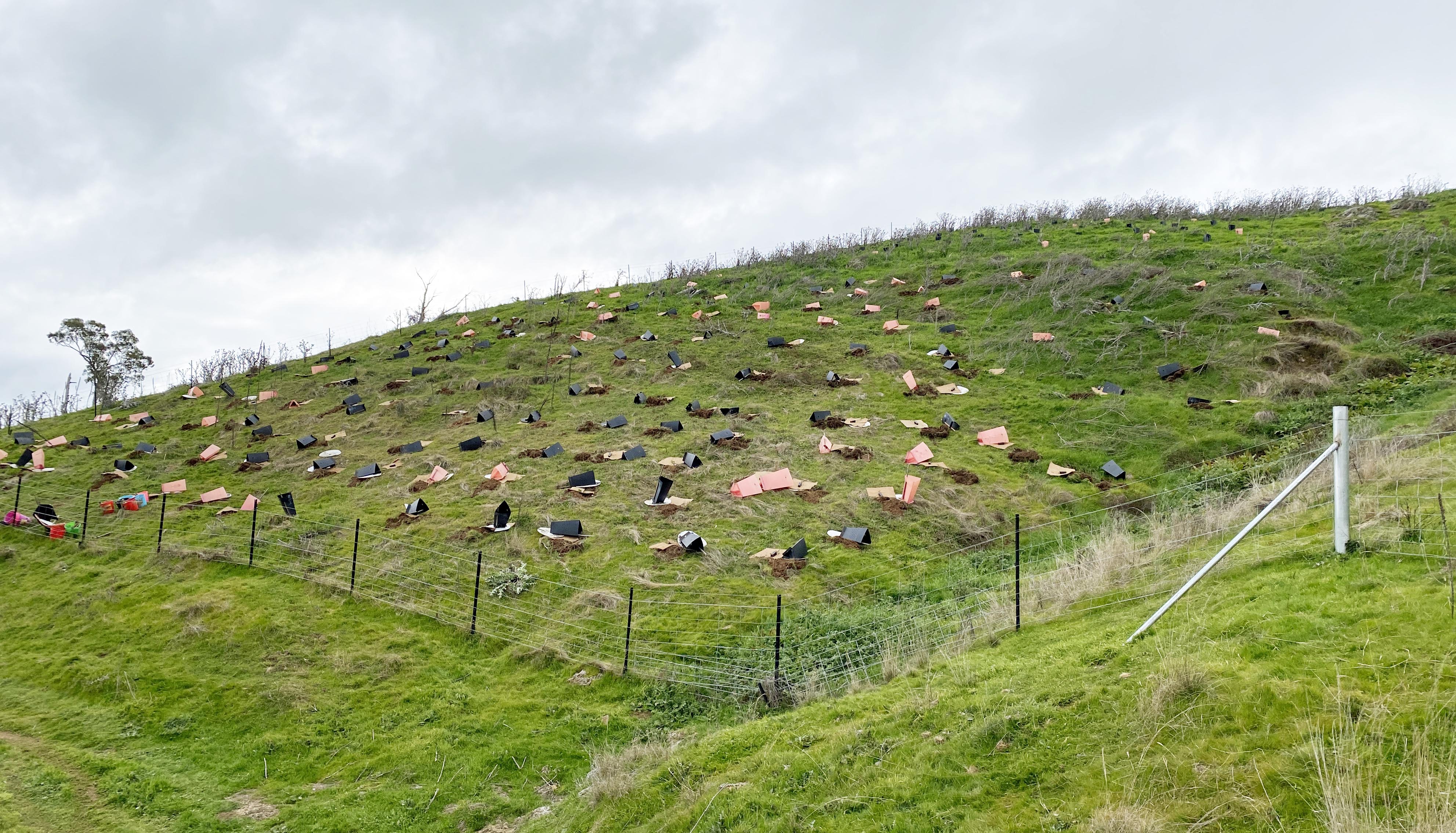 With no funding available for fences, my main goals for new trees was to go back to the areas that were not finished in other years. In particular, last year’s Top of the Gully was specifically left for this year. We ended up putting in another 550 there, 40 of them replants, to make a fairly dense windbreak area.
