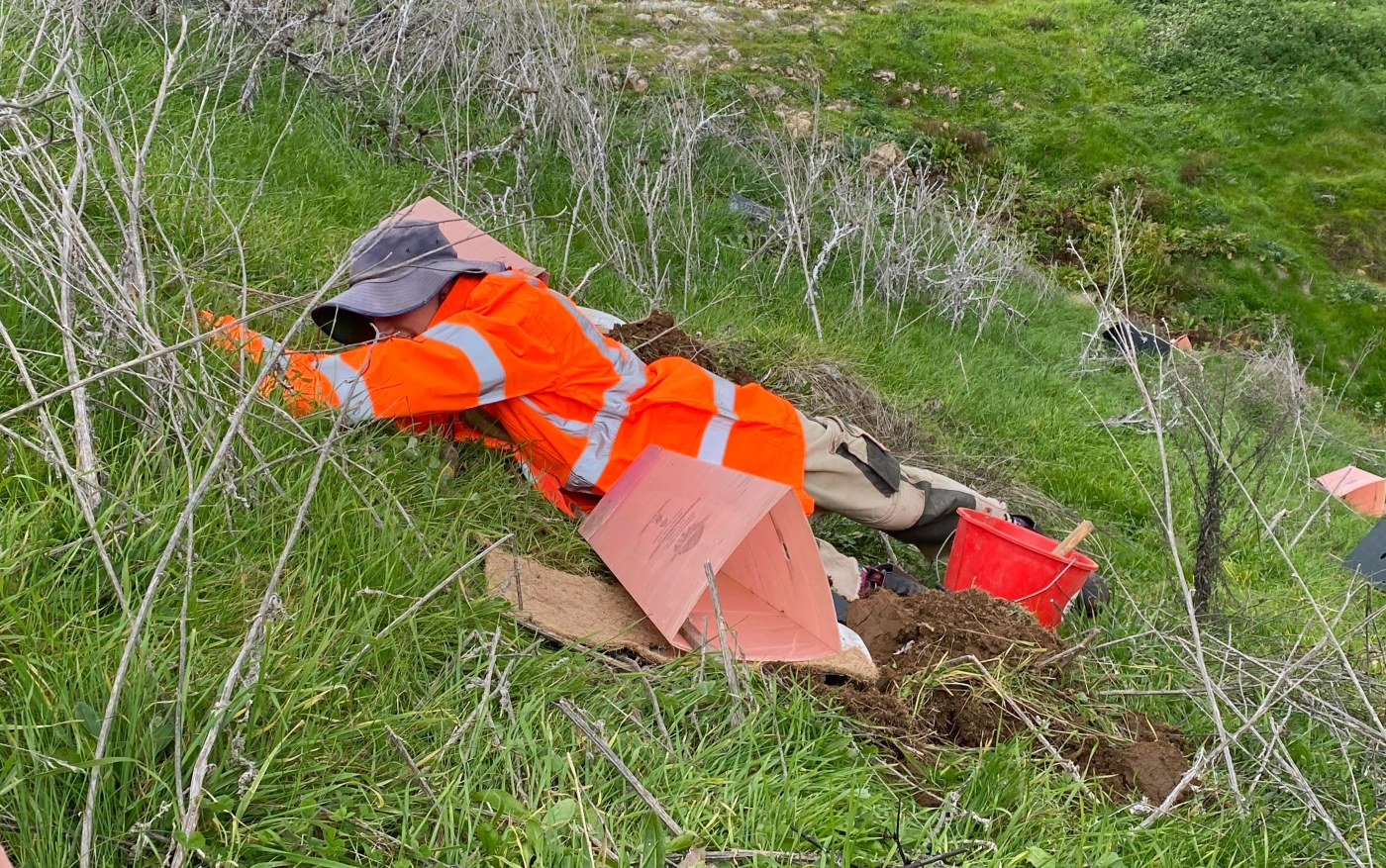 First we had to go back and find the trees that didn’t quite make it from last year. I’ve now conclusively established that Phalaris grass is a killer of young native trees, and has to be sprayed out to stop it doing that . The only other grass that is a similar problem is couch. Otherwise the mulch maps are effective. We had to re-do 80 in one of last year’s windbreaks, but the main area along the pine line was in very good shape (no Phalaris).