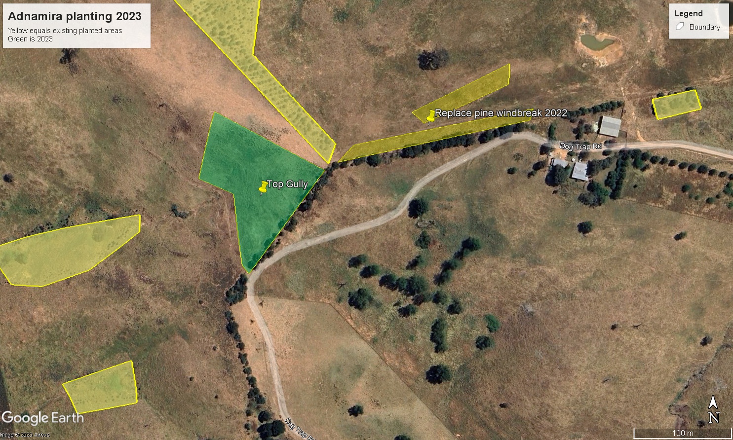 With no funding available for fences, my main goals for new trees was to go back to the areas that were not finished in other years. In particular, last year’s Top of the Gully was specifically left for this year. We ended up putting in another 550 there, 40 of them replants, to make a fairly dense windbreak area.