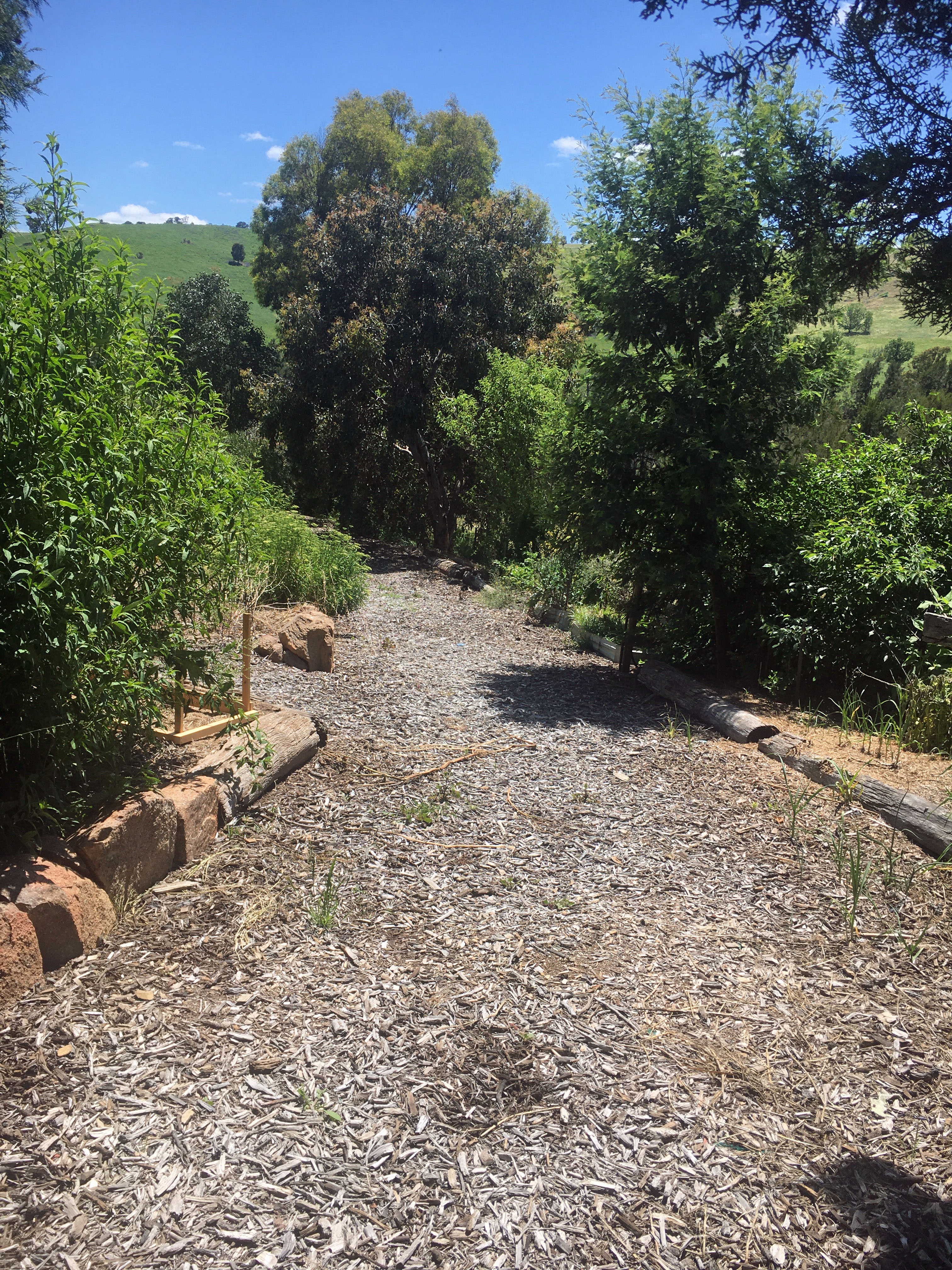 After watching a video about a permaculture garden in clay soil being massively improved by large quantities of woodchips, I realised that I had inadvertently made my veggie garden pathways beautifully fertile by mulching them. Instead of suppressing weeds, the numbers of unwanted plants have been increasing each year. So much so that a visiting friend looked at one (weedy) area and asked “Is this supposed to be some sort of path?” Since woodchip mulch is also a fire risk, now the plan is to use the Bobkitten to scrape up all this nice soil and put it in the raised veggie garden beds, and put gravel from our farm pit on the paths, making a better fire-safe barrier. That is, as long as I rake off leaves and sticks.