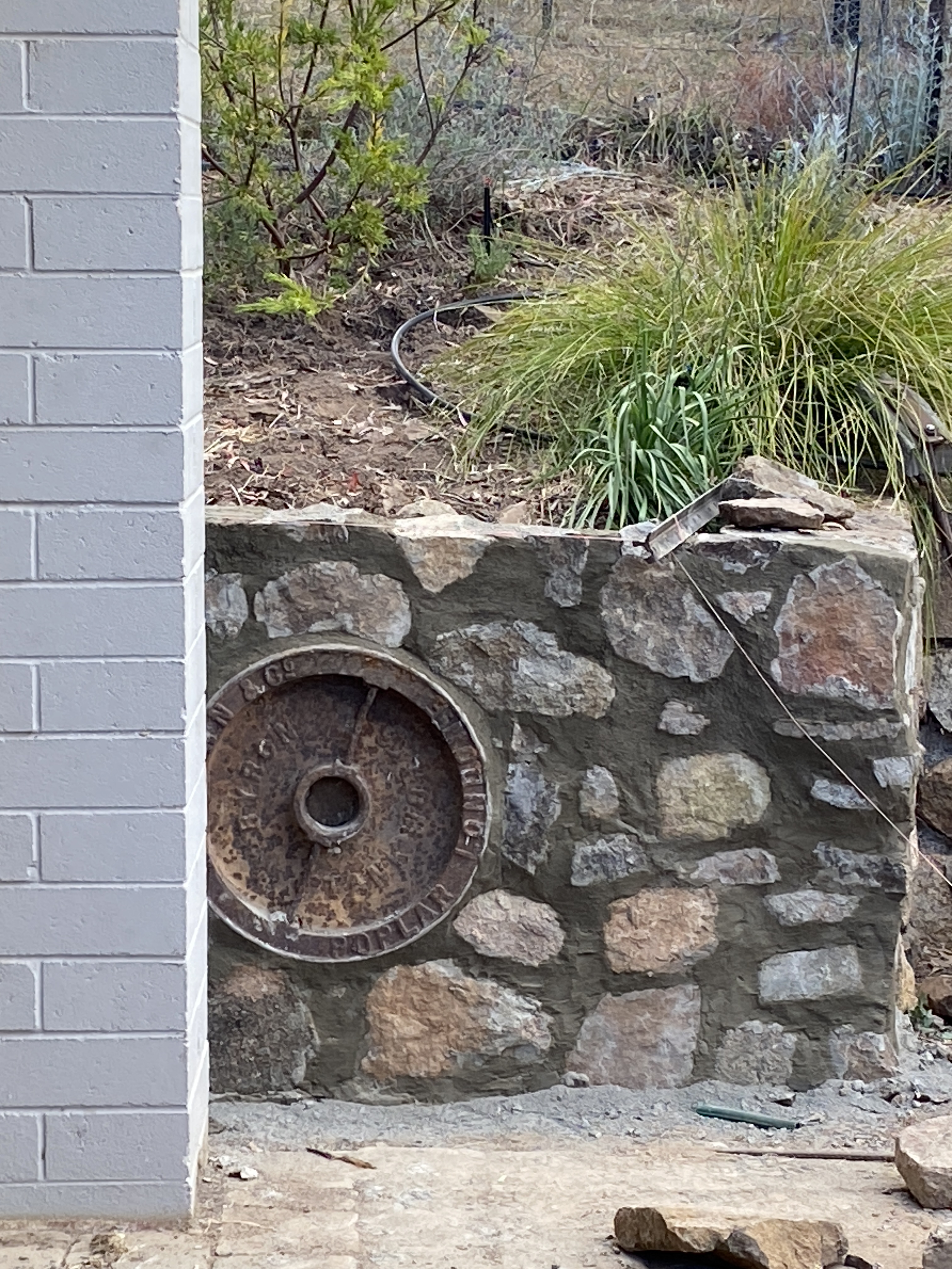 The second was replacing the rotten timber wall in the carport with a new stone wall, built by James the Bobcat Master, and including an old flywheel we picked up in the paddock.