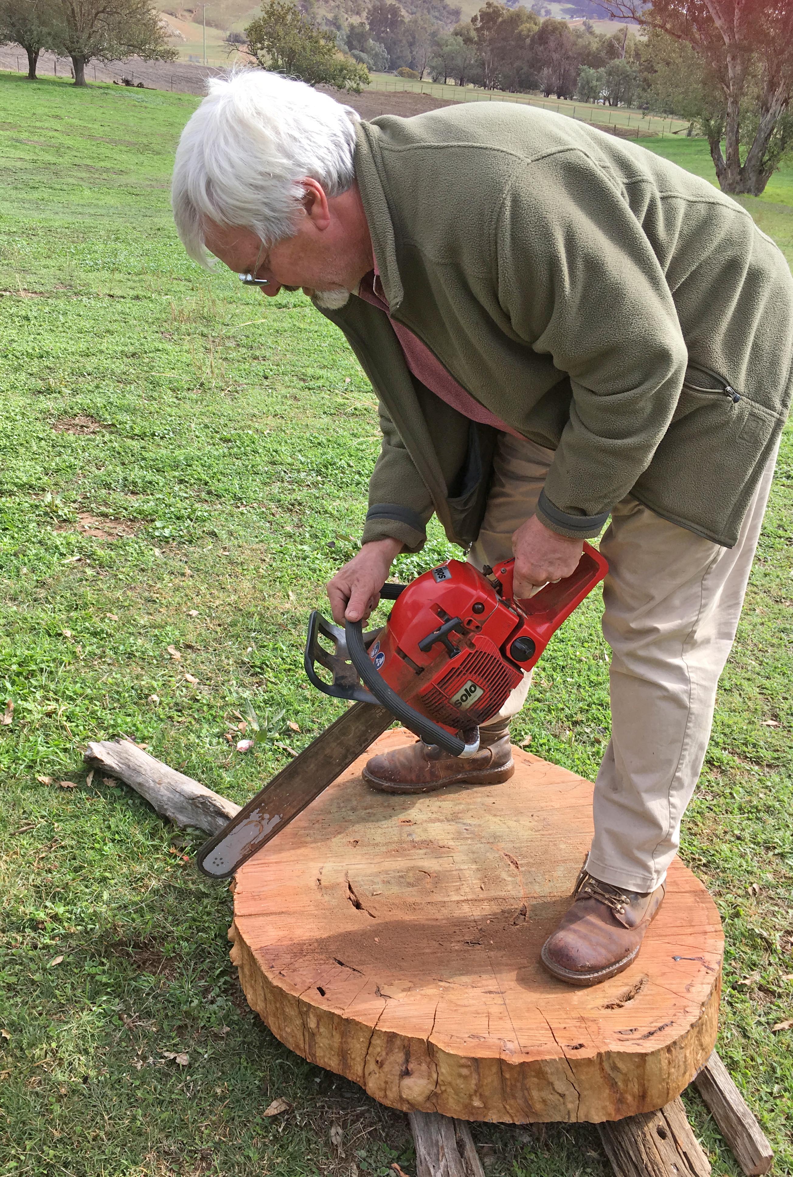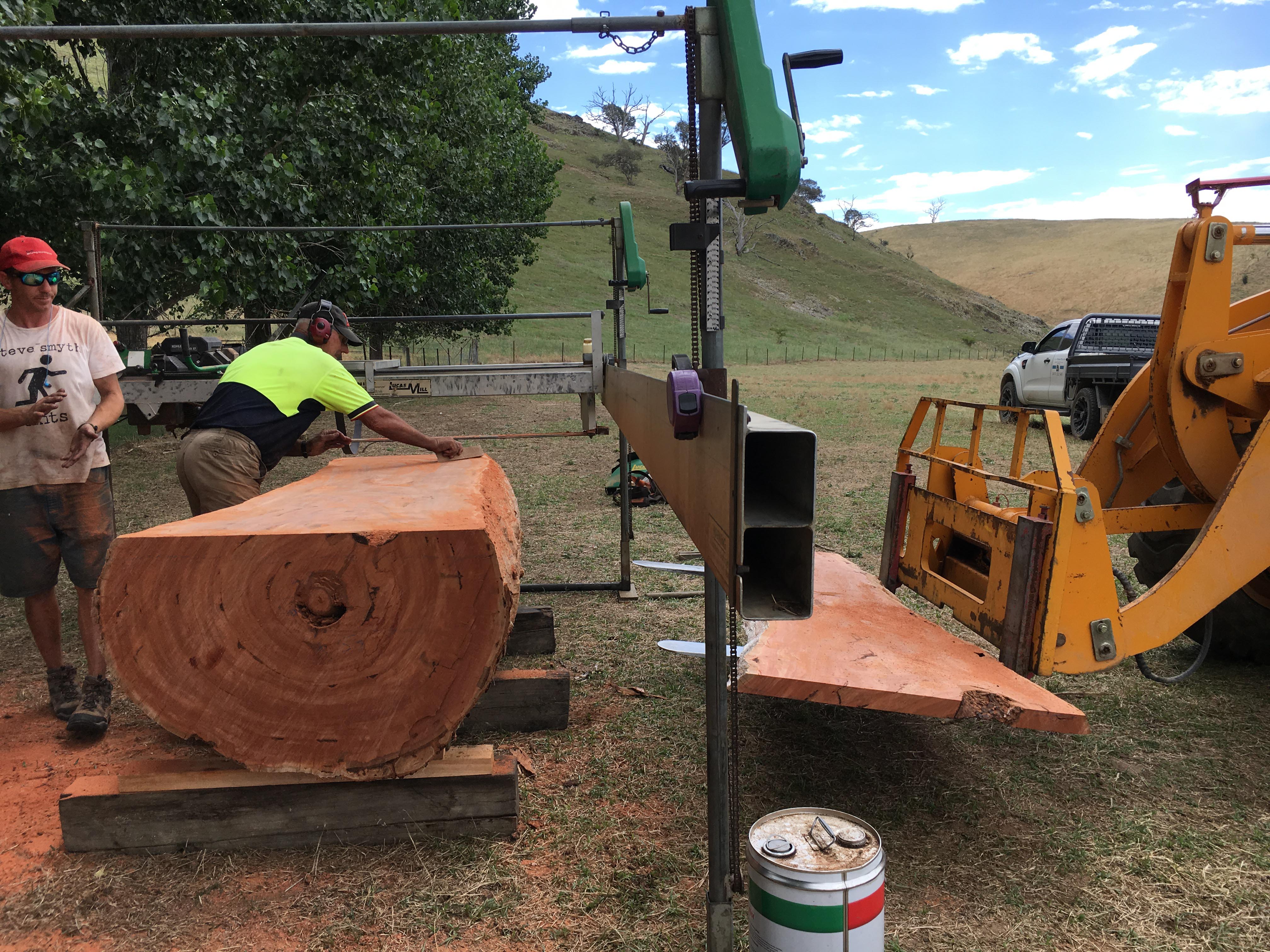 Then he picked up the 2.4 metre long section of the main trunk and carried it over to where he set up his portable mill. Then he made 40-60mm thick slices from the upper trunk. The mill is basically a long chain saw set in a frame to keep it equally spaced.