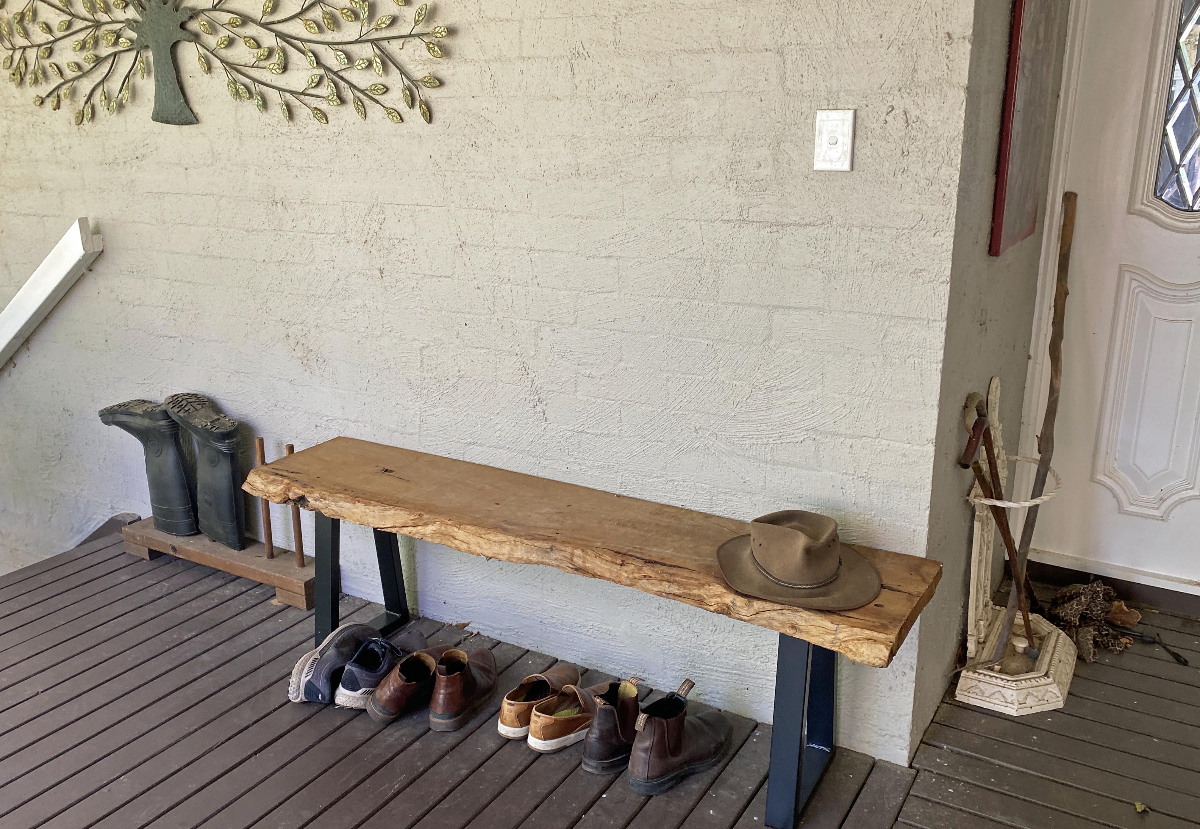 Luckily, Charles and his girlfriend Celia came here in December and persuaded Craig to help them turn two more big slabs into three benches for taking off shoes near our front door. Once again Craig cut the slabs for width and Charles and Celia attached the metal legs I’d bought online.