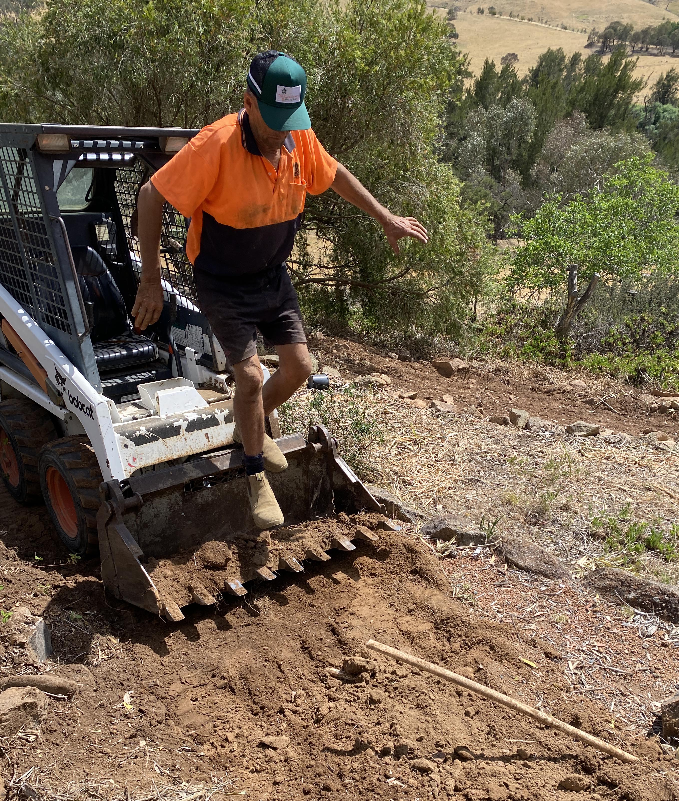 Charlie, visiting from Vienna, learned to drive the little Bob-Kitten and trundled back and forth with big boulders in the bucket. He and Dmitry also learned how to lay pavers (to James’s fierce standards) as edging for the new areas that are now garden rather than lawn.  We took the opportunity to convert a garden path through the veggie area to gravel as well, as part of my fire safety plan.